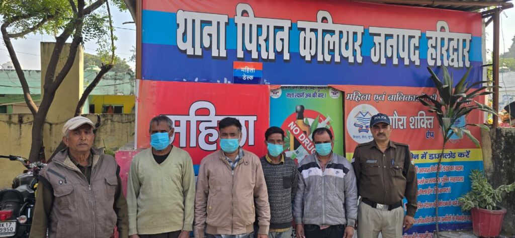 कलियर पुलिस व गौवंश स्क्वॉड की संयुक्त कार्रवाई—अवैध पशु कटान करते 04 आरोपी रंगे हाथ गिरफ्तारकब्जे से 160 किलो पशु मांस, अवैध पशु कटान के उपकरण तथा एक जीवित गौवंश बरामद हरिद्वार। वरिष्ठ पुलिस अधीक्षक हरिद्वार द्वारा जनपद में गौकशी एवं अवैध पशु कटान पर पूर्ण प्रतिबंध सुनिश्चित करने हेतु सभी थाना प्रभारियों एवं गौवंश संरक्षण स्क्वाड को कड़े निर्देश जारी किए गए हैं।इसी क्रम में उत्तराखण्ड गौवंश संरक्षण स्क्वाड एवं थाना पिरान कलियर पुलिस की संयुक्त टीम द्वारा एक प्रभावी अभियान चलाया गया।दिनांक 29.11.2025 को प्राप्त मुखबिर सूचना के आधार पर तेलियान मस्जिद, कलियर के निकट छापेमारी की गई, जहाँ मन्ना नामक व्यक्ति अपने तीन साथियों के साथ अवैध रूप से पशुओं का कटान करता पाया गया। पुलिस एवं गौवंश स्क्वाड टीम ने मौके पर पहुँचकर चारों आरोपियों को रंगे हाथ गिरफ्तार कर लिया।आरोपियों के विरुद्ध मु0अ0सं0 332/2025, पशु क्रूरता निवारण अधिनियम में अभियोग पंजीकृत कर आवश्यक विधिक कार्रवाई की जा रही है।पुलिस टीम रविन्द्र कुमार – थानाध्यक्ष,हे0का0 रविन्द्र कुमार बालियान,हो0गा0 ललित कुमारगौवंश संरक्षण स्क्वाड टीम उ0नि0 शरद सिंह,हे0का0 सुनील सैनी,का0 प्रवीण कुमार,का0 राजेन्द्र।