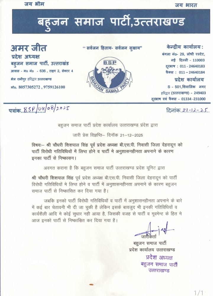 हरिद्वार, 21 दिसंबर 2025। बहुजन समाज पार्टी उत्तराखंड प्रदेश यूनिट ने कड़ा कदम उठाते हुए चौधरी शीशपाल सिंह, पूर्व प्रदेश अध्यक्ष बीएसपी एवं निवासी जिला देहरादून, को पार्टी से निष्कासित कर दिया है। यह कार्रवाई पार्टी विरोधी गतिविधियों में लिप्त रहने तथा पार्टी अनुशासन का बार-बार उल्लंघन करने के आरोपों के चलते की गई है।