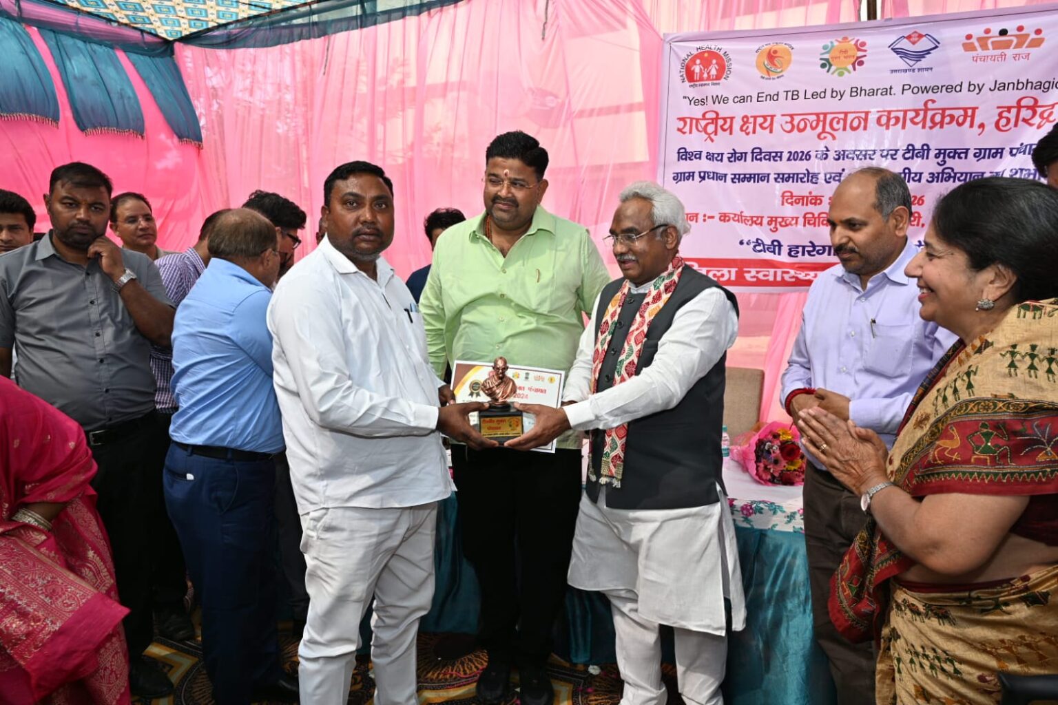 कार्यक्रम में मुख्य अतिथि के रूप में उपस्थित कैबिनेट मंत्री मदन कौशिक ने टीबी उन्मूलन अभियान में उत्कृष्ट कार्य करने वाले ग्राम प्रधान ,वेलेंटियर्स,आशा कार्यकर्ताओं एवं स्वास्थ्य विभाग को प्रमाण पत्र एवं स्मृति चिन्ह भेंट कर सम्मानित किया। उन्होंने कहा कि “टीबी हटेगा, देश जीतेगा” केवल एक नारा नहीं, बल्कि एक संकल्प है, जिसे सरकार और समाज के संयुक्त प्रयासों से ही साकार किया जा सकता है। उन्होंने सभीग्राम प्रधानों, वेलेंटियर्स, आशा कार्यकर्ताओं एवं स्वास्थ्य विभाग की टीम की सराहना करते हुए कहा कि उनकी सक्रिय भागीदारी से ही टीबी के खिलाफ लड़ाई को मजबूती मिल रही है।उन्होंने कहा कि ग्राम प्रधानों, वालेंटियर्स एवं स्वास्थ्य विभाग के अधिकारियों एवं कर्मचारियों की सहभागिता से ही राष्ट्रीय कार्यक्रम को टीबी मुक्त ग्राम बनाने के लिए मेहनत की है।उन्होंने कहा कि स्वास्थ्य के क्षेत्र में कई लक्ष्य आयेंगे जिन्हें सभी को आपसी संवे के साथ हासिल करना है।उन्होंने कहा कि जनपद की 37 ग्रामों को टीबी मुक्त करने के लिए स्वास्थ्य विभाग की टीम सहित ग्राम प्रधानों एवं वेलेंटियर्स को प्रयासों की सराहना करते हुए उन्हें बधाई एवं शुभकामनाएं दी।