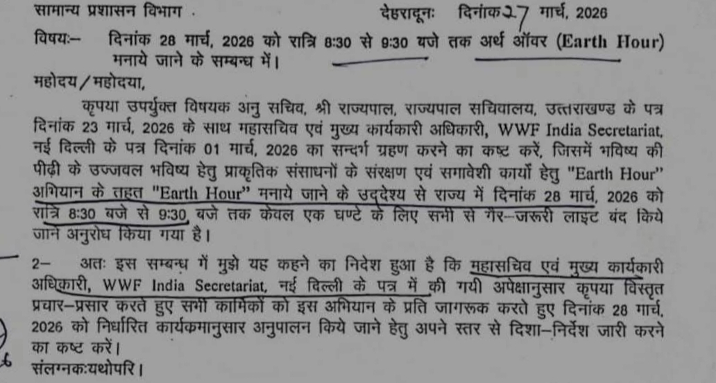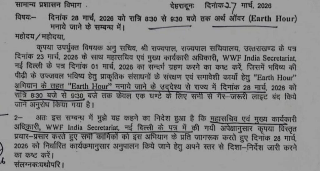 हरिद्वार 28 मार्च 2026।शासन के निर्देशों के क्रम में जिलाधिकारी मयूर दीक्षित ने अवगत कराया है कि प्राकृतिक संसाधनों के संरक्षण एवं भावी पीढ़ियों के उज्ज्वल भविष्य हेतु “अर्थ आवर (Earth Hour)” अभियान के अंतर्गत आज दिनांक 28 मार्च, 2026 को रात्रि 8:30 बजे से 9:30 बजे तक एक घंटे के लिए गैर-जरूरी विद्युत लाइट बंद रखने का आह्वान किया गया है।